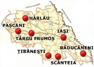 Andrieşeni, Aroneanu, Bârnova, Bivolari, Bosia, Ciurea, Golăieşti, Holboca, Horleşti, Iaşi, Leţcani, Mogoşeşti, Movileni, Popricani, Probota, Rediu, Roşcani, Schitu Duca, Tomeşti, Trifeşti, Ţigănaşi, Ţuţora, Valea Lupului, Victoria, Voineşti şi Vlădeni.